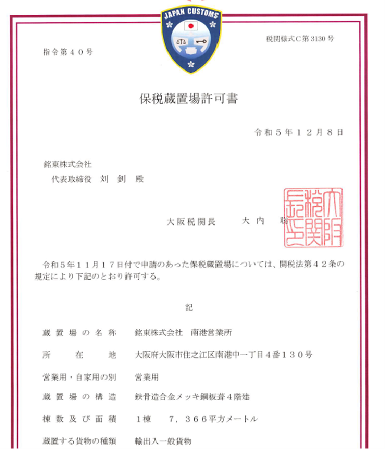 by铭东株式会社 2025-04-22 08:24:59 尊敬的各位供应商非常感謝您一直以來的支持。 谨此通知您,我司南港保税仓现已正式运营,该自营保税仓是大阪海关许可的正规保税仓库,距离大阪南港码头仅2KM,7300㎡可满足各种保税操作需求。 我们期待今后您的持续支持与惠顾 敬启铭东株式会社 日本保税仓 日本海外仓 Previous Post 关于东京GLP新仓建立的通知 Next Post 大阪国际邮政局感谢状授予
